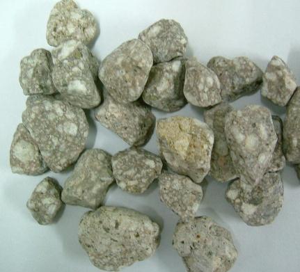 成岩。有风化、粘土化长石的斑晶和石英结晶镶嵌于淡黄褐色的石基中,其中有因黑云母被氧化而形成的氧化铁,构成了松散的外观。麦饭石含有的成分: 1)氧化亚铁1.29%;(2)氧化铁1.40%;(3)无水磷(磷酸酐)0.26%;(4)氧化锰0.02%;(5)镁3.55%;(6)钾3.19%;(7)吸附水1.10%;(8)氧化钙2.00%;(9)钠3.16%;(10)钛0.30%;(11)结合水0.90%(+)。而且,麦饭石不含放射能。